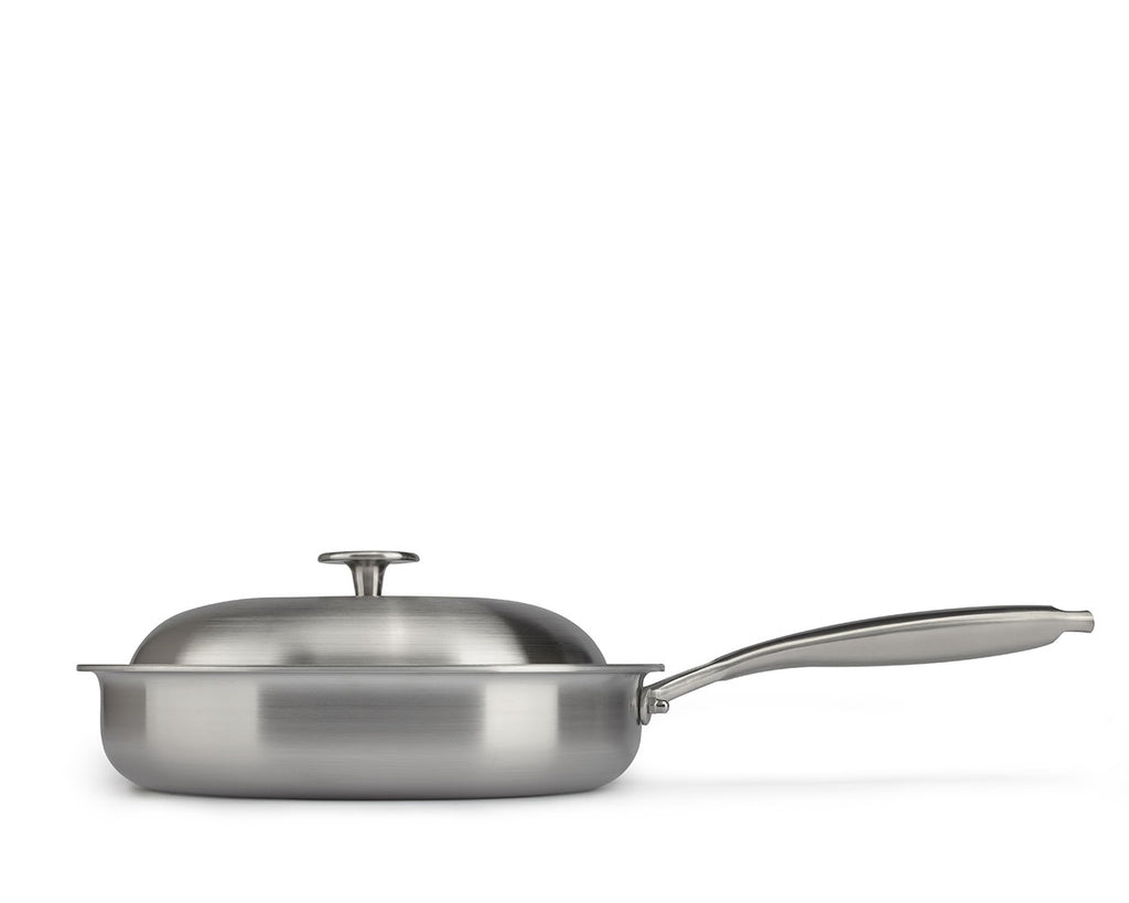 This pan is extremely versatile due to its straight sides and good depth/capacity. Ideal for grilled or fried dishes as well as stews and tasty risottos. Thanks to the easy handling it also allows you to sauté pasta. Single-body structure in multi-layer, consisting of three sheets of three different metals: titanium for the surface in contact with food, aluminum for the internal sheet and AISI 430 stainless steel for the outside, . Equipped with a long hollow steel handle: ergonomic, it guarantees an excellent grip and does not overheat during cooking. Slightly convex  nickel-free steel lid, perfect for retaining steam and increasing the capacity.